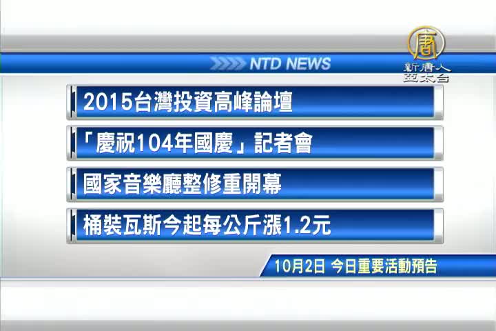 【新唐人亞太台 2015 年 10 月 02 日訊】接著看到,今天,10月2日,星期五,有哪些重要活動。首先是,2015台灣投資高峰論壇。接著,「慶祝104年國慶」記者會。再來,國家音樂廳歷時四個月整修後,今天重新開幕。另外,民生消費訊息,桶裝瓦斯今天起,每公斤漲1.2元。