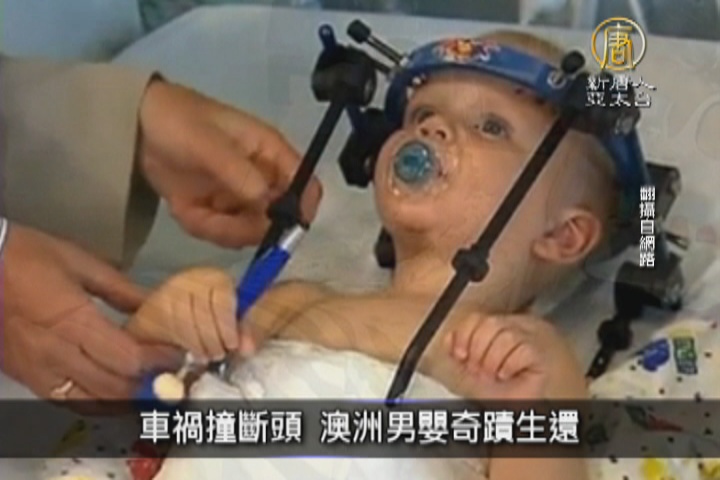 【新唐人亞太台 2015 年 10 月 04 日訊】澳洲一位16個月大的男嬰,與他的媽媽和姐姐遭遇車禍。男嬰的頭與脖子斷開,如同遭斬首。經過醫院艱苦的6小時手術後,醫生們用一小段電線和男嬰的一塊肋骨,將男嬰頸椎骨接上,醫師說預計八週後,就可以恢復正常生活,被稱為奇蹟。