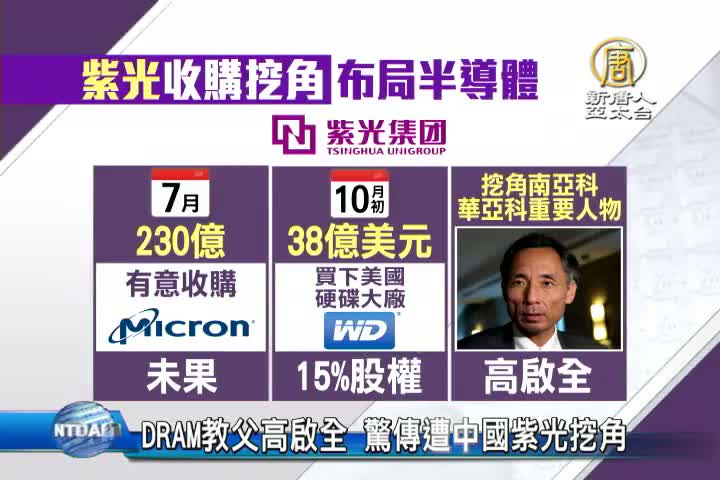 【新唐人亞太台 2015 年 10 月 05 日訊】產業界重要消息,中國清華紫光集團,日前打算收購美光未果,卻傳出,打算直接挖角台灣重要關鍵人才,有DRAM教父之稱的華亞科董事長高啟全,可能改披戰袍,出任紫光集團的全球執行副總裁,令產業界大震撼。