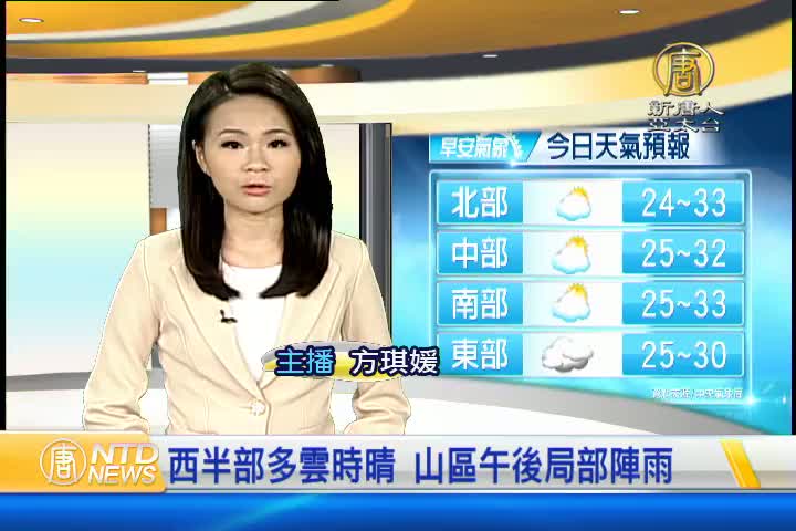 【新唐人亞太台 2015 年 10 月 06 日訊】歡迎您收看10月6日的早安新唐人,我是方琪媛。先來帶您關心今天的天氣情況。受東北風影響,今天西部地區晴朗,而東部是多雲短暫陣雨,午後,在南部和中部的山區,容易出現局部短暫雷陣雨。不過白天高溫仍然會有秋老虎的感覺,高溫可達33度。另外,彩雲颱風今天開始北轉,朝日本東方海面移動,這幾天有計劃前往日本的朋友要注意彩雲颱風對天氣的影響。帶您一起來看到國際媒體重要訊息。