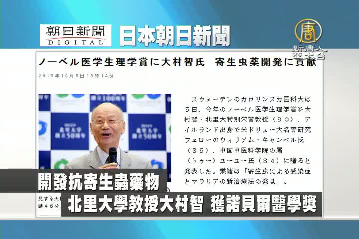 【新唐人亞太台 2015 年 10 月 06 日訊】來看到日本朝日新聞報導:開發抗寄生蟲藥物 北里大學教授大村智 獲得諾貝爾醫學獎