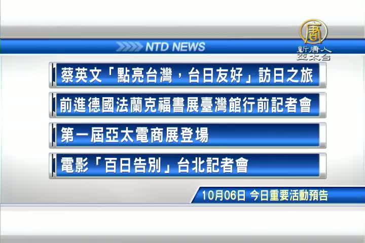 【新唐人亞太台 2015 年 10 月 06 日訊】接著看到,今天,十月6日,星期二,有哪些重要活動,民進黨主席蔡英文展開「點亮台灣,台日友好」訪日之旅;第一屆亞太電商展在南港展覽館登場;以及,電影「百日告別」台北記者會。