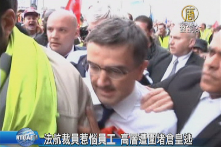 【新唐人亞太台 2015 年 10 月 06 日訊】在難以抵擋廉價航空的競爭壓力下,法航周一宣佈重整計劃,2017年之前將裁員2900人,並停飛14個長程航班,一聽到這個消息,上百名聚集在法航總部外抗議的員工氣憤地衝進會議室,迫使開會中斷,法航的人資主管 及資深經理的西裝襯衫當場被扯爛,最後是在保全護送下爬過護欄狼狽地離開現場,法航4個工會已經準備發動罷工,法航譴責暴力衝突,並強調不論如何都會執行裁員計畫,並且將對滋事者提告。