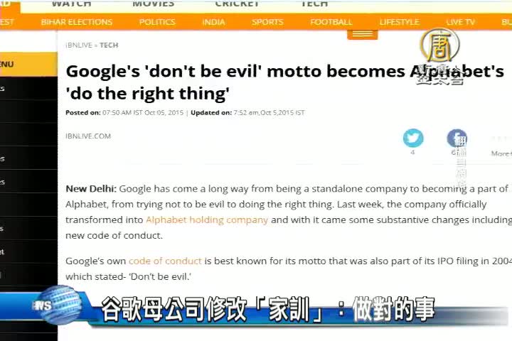 【新唐人亞太台 2015 年 10 月 06 日訊】全球網路搜尋引擎Google,從這個星期一開始,改由新成立的母公司「Alphabet」取代上市,而新公司的座右銘,也改變了,過去,谷歌著名的公司原理原則「不做惡事 Don't be evil」,將變成「Do the right thing 做對的事」。現在「Alphabet」在網上公佈的專業行為守則中,寫的很清楚。「Alphabet、其子公司及受控附屬公司的員工,應做對的事:遵守法律、光明正大、互相尊重」。