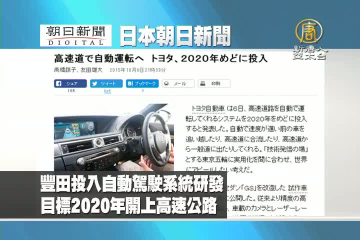 【新唐人亞太台 2015 年 10 月 07 日訊】來看到日本朝日新聞報導:豐田投入自動駕駛系統研發 目標2020年開上高速公路