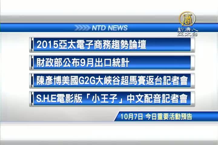 【新唐人亞太台 2015 年 10 月 07 日訊】接著看到,今天,十月7日,星期三,有哪些重要活動,2015亞太電子商務趨勢論壇登場;財政部公布9月出口統計 ;陳彥博美國G2G大峽谷超馬賽返台記者會;以及,S.H.E現身電影版「小王子」中文配音記者會。