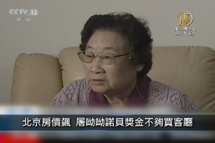 【新唐人亞太台 2015 年 10 月 07 日訊】中國大陸藥學家屠呦呦榮獲2015年諾貝爾醫學獎,將可獲得約1500萬台幣獎金,她和丈夫接受媒體訪問時笑說,「這點獎金還不夠買北京的半個客廳吧?!」根據大陸房價點評網,北京市區房價今年每坪約新台幣66萬元到132萬元之間。