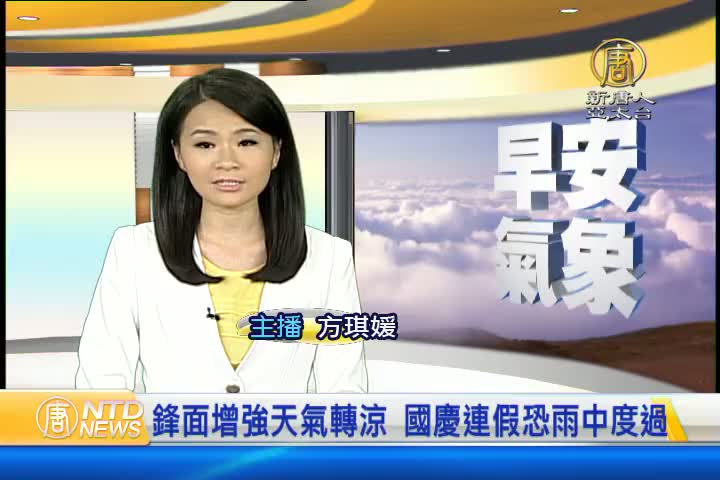 【新唐人亞太台 2015 年 10 月 08 日訊】歡迎您收看10月8日的早安新唐人,我是方琪媛。先來帶您關心今天的天氣情況。受到鋒面及東北風增強的影響,從今天開始北部及東北部天氣開始轉涼,接下來三天的國慶連假,全台各地降雨的機率增加,各地高溫 雖然還是有27到30度,不過民眾需要注意氣溫的變化,建議您出門最好還是攜帶雨具。帶您一起來看到國際媒體重要訊息。