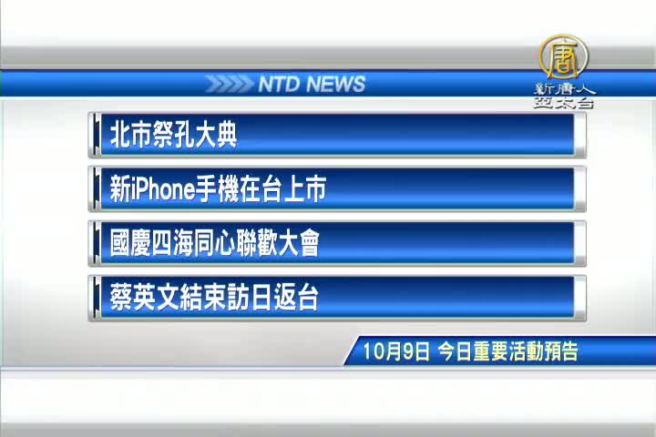 【新唐人亞太台 2015 年 10 月 09 日訊】接著看到,今天,十月9日,星期五,有哪些重要活動,首先是,因颱風來襲延遲舉行的北市祭孔大典;iPhone新手機在台灣正式開賣;下午登場的國慶四海同心聯歡大會;以及,結束訪日行程的民進黨主席蔡英文晚間抵台。