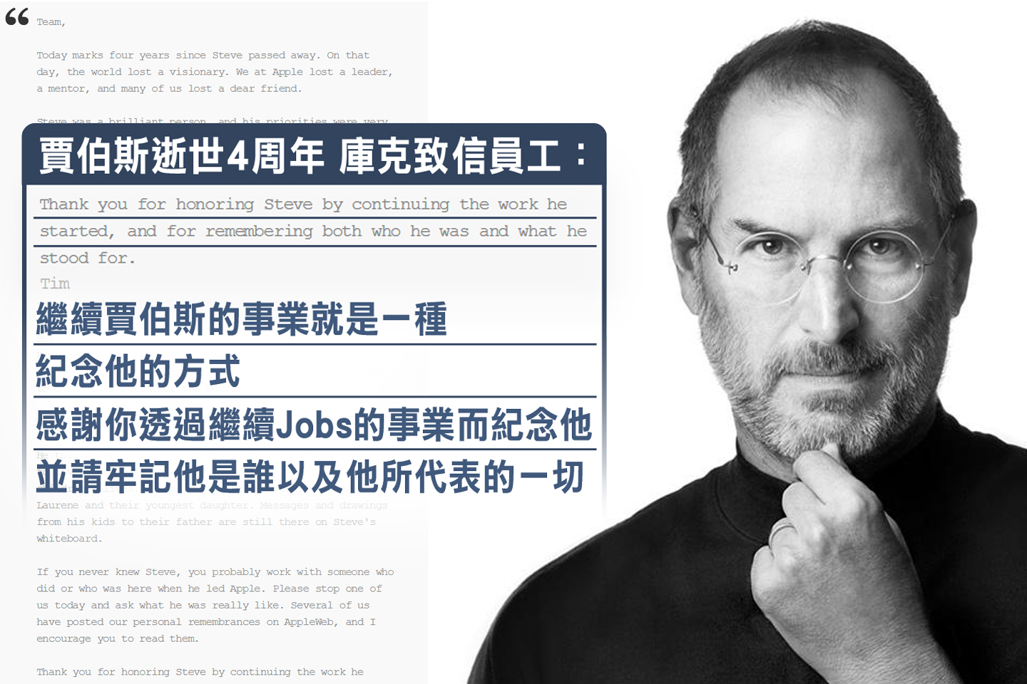 10月5日是賈伯斯逝世四周年,庫克特別以一封對員工的公開信,表達紀念與感懷。