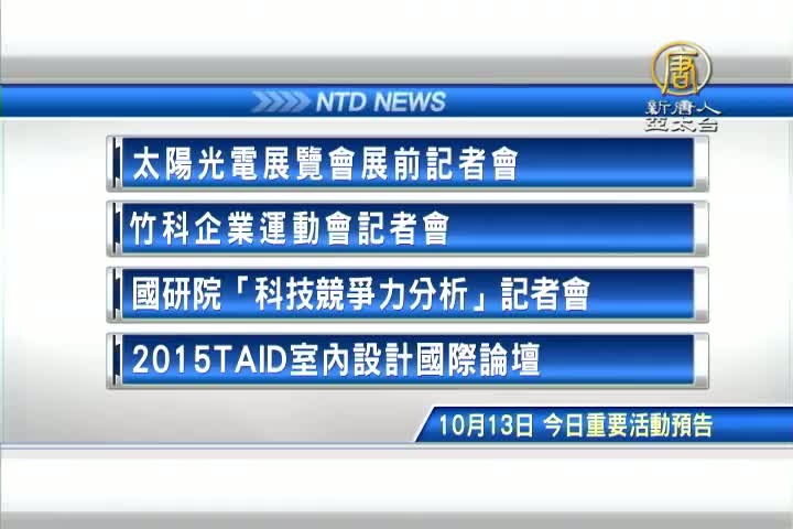 【新唐人亞太台 2015 年 10 月 13 日訊】接著看到,今天,10月13日,星期二,有哪些重要活動。台灣國際太陽光電展覽會 展前記者會。竹科企業運動會宣傳記者會。國家實驗研究院「我國科技競爭力分析」記者會。2015TAID室內設計國際論壇。