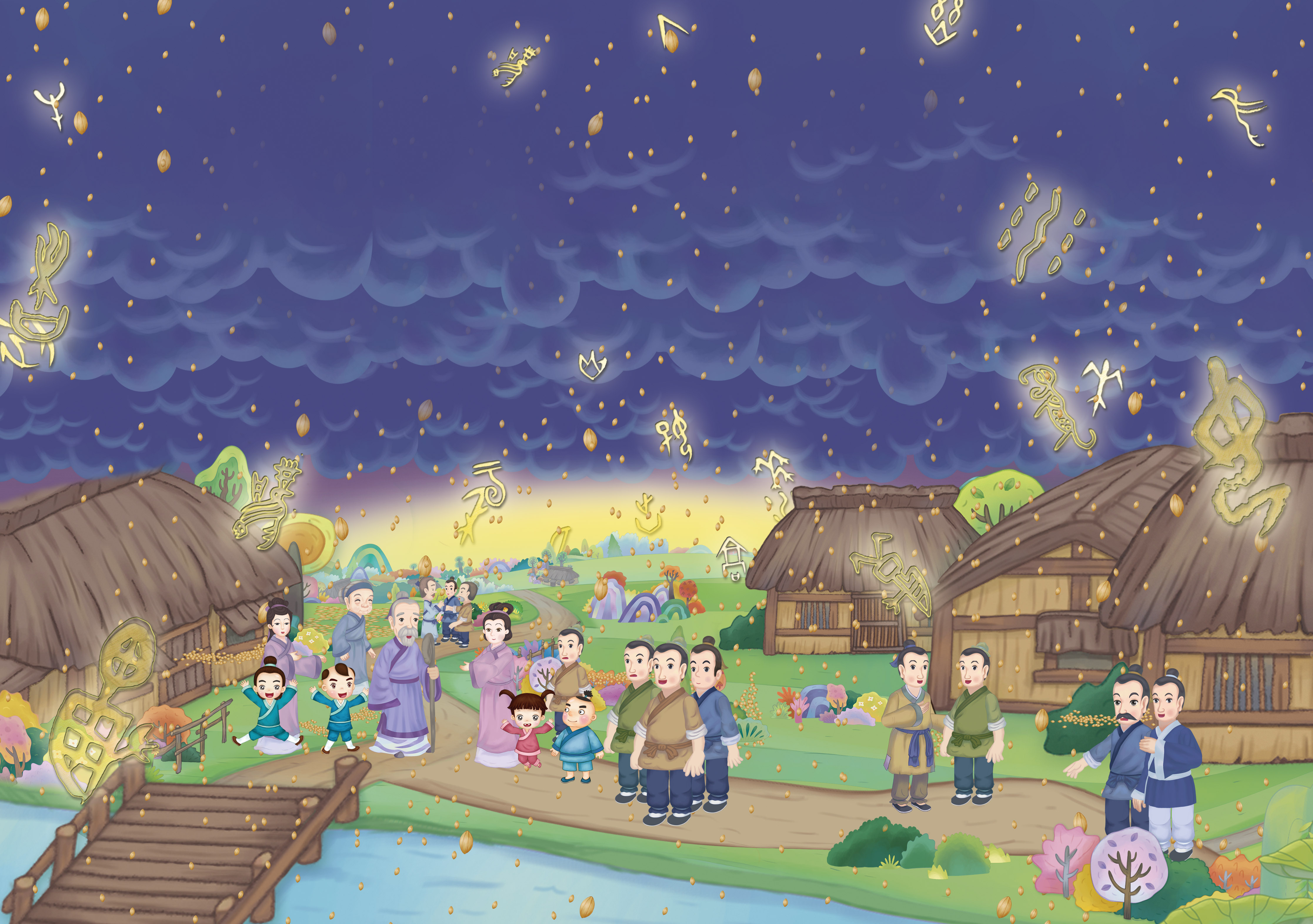 天上的神欣喜地降下了小米,慶祝人類有了文字,從此就能記載事情、開啟智慧。