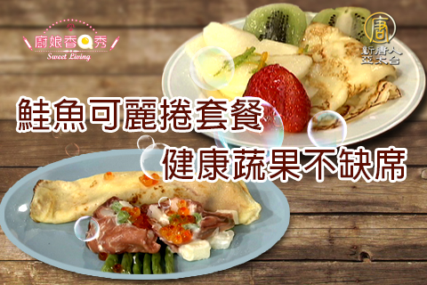 許多人都希望吃得營養又不發胖,而沙拉看起來是不錯的選擇,擅長美食的李鳳麗將美味繽紛舒活新鮮的沙拉加上燻魚片、酸奶捲起裝盤,並放上四季豆、鮭魚卵.然後另將煎熟的可麗餅,加上浸泡的蘋果片、草莓,再淋上檸檬、柳丁醬汁即是一道好吃極了的鮭魚可麗捲套餐.