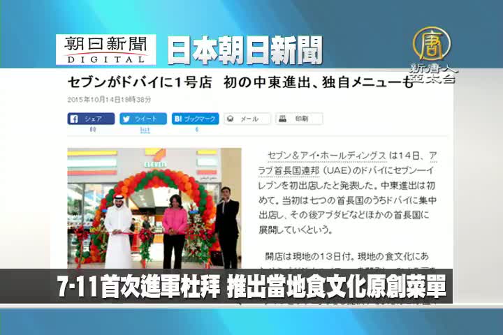【新唐人亞太台 2015 年 10 月 15 日訊】來看到日本朝日新聞報導:7-11首次進軍杜拜 推出當地食文化原創菜單