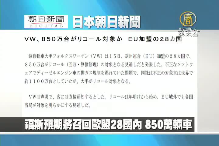 【新唐人亞太台 2015 年 10 月 16 日訊】來看到日本朝日新聞報導:福斯預期將召回歐盟28國內 850萬輛車