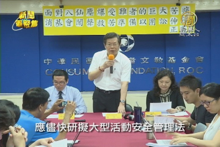 消基會也呼籲政府與立法院,應儘快研擬「大型活動安全管理法」,要求舉辦活動的單位提出風險管理機制,並且宣布將啟動團體訴訟,為這次八仙塵爆所有的受害民眾,討回應有的權益。