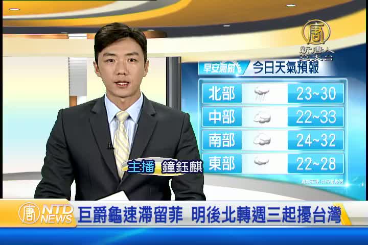 【新唐人亞太台 2015 年 10 月 19 日訊】歡迎您收看10月19日的早安新唐人,我是鐘鈺麒。先來帶您關心今天的天氣情況。受到「巨爵」颱風外圍雲系影響,今天台灣北部、東部地區及澎湖、馬祖有短暫陣雨。北部氣溫約為24到28度,中部地區23到32度,東部地區約23到28度,南部地區則為24到30度。氣象局預估,「巨爵」週四、週五將最靠近台灣,而最快週二下半天,就會發布海上颱風警報。帶您一起來看到國際媒體重要訊息。