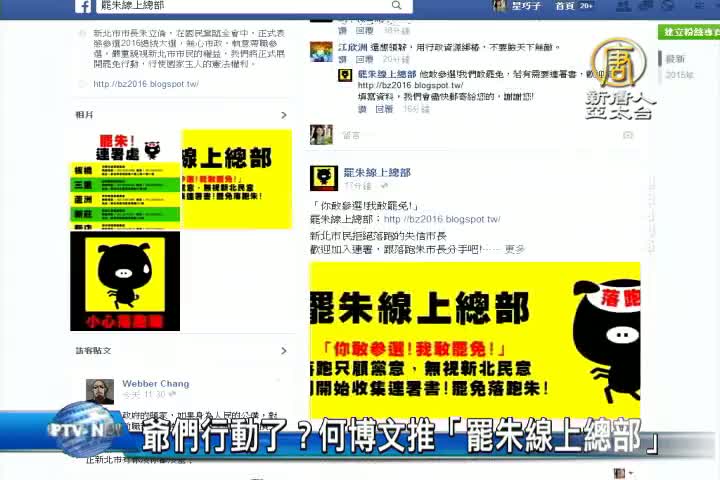 【新唐人亞太台 2015 年 10 月 19 日訊】在朱立倫宣布帶職參選後,新北市議員何博文 馬上在臉書與部落格上,成立了「罷朱線上總部」,認為朱立倫當初承諾要做滿做好,卻無視於市政成績吊車尾,仍執意帶職參選,拋棄新北市民,要發動罷免落跑朱。還附上連署地點與連署書的格式。另外,曾公開挺身「護柱」的氣象主播李富城也展現霸氣,正式成立「廢票聯盟」,說要讓國民黨中央黨部感受到他們的憤怒。而之前曾經嗆說,國民黨如果做掉洪秀柱,就要帶頭衝國民黨的前國發會主委管中閔,如今卻感嘆說「算了」,科技人 翟本喬在臉書上透露他在演講場合,與管中閔的對話,管中閔說,寧願把時間,花在還有救的人身上。