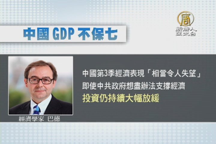 【新唐人亞太台 2015 年 10 月 19 日訊】中共去年GDP7.5%的目標沒有達成,今天最新消息,第三季的GDP,只來到6.9%,確定不保七,外界分析,中共對於股市、匯率的操弄,無法改變中國經濟成長減緩的腳步。