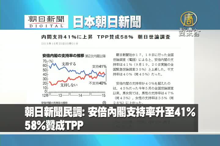 【新唐人亞太台 2015 年 10 月 20 日訊】來看到日本朝日新聞報導:朝日新聞民調: 安倍內閣支持率升至41% 58%贊成TPP