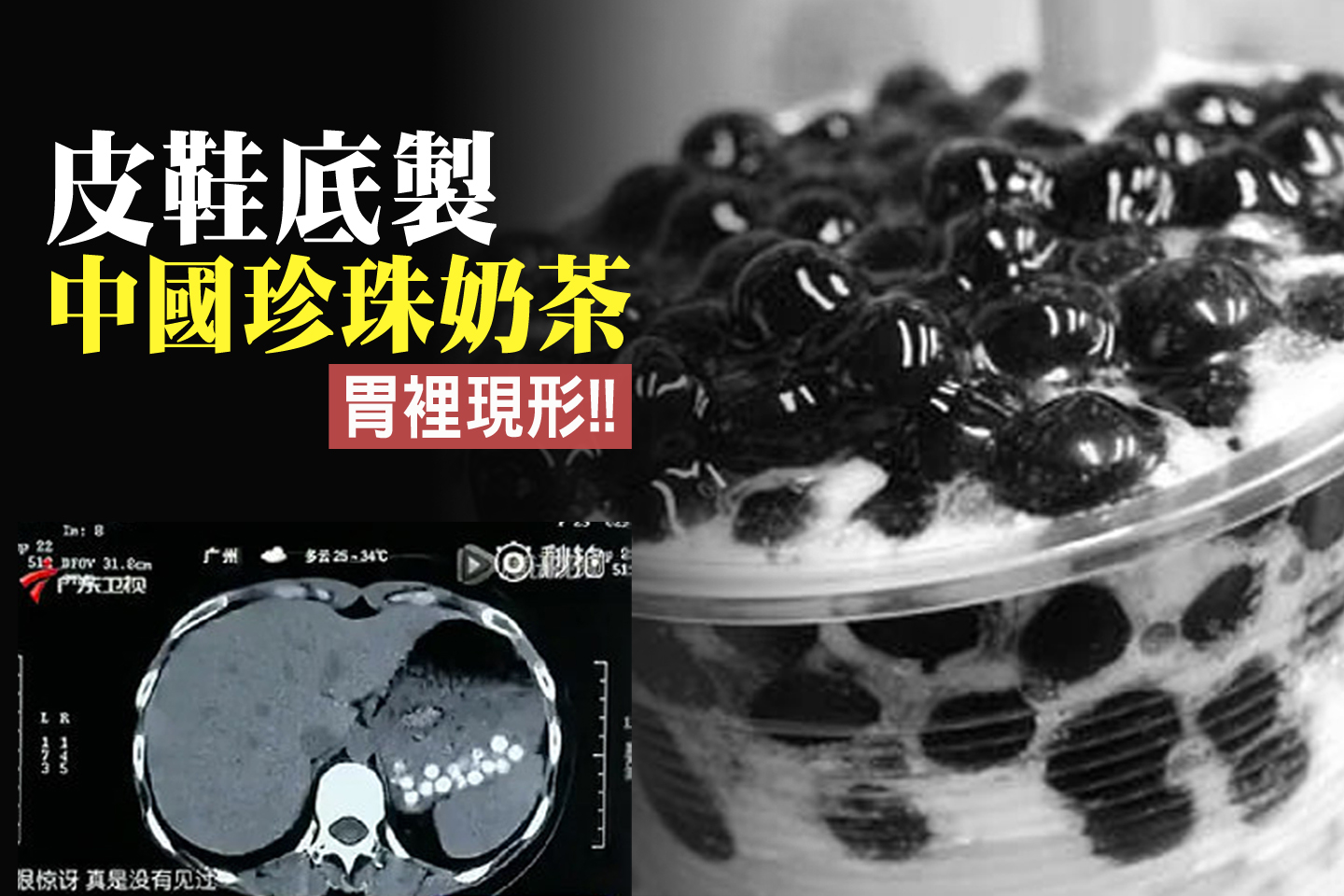 之前為您報導過,中國民眾一張胃部CT片在網上熱傳,胃裡密密麻麻的小白點,竟是喝進肚裡未消化的珍珠奶茶,經樣本檢測顯示膠性極強。山東青島一經營店店員稱:「珍珠這個東西,說白了吧,就是拿皮鞋底、廢舊輪胎做的。」