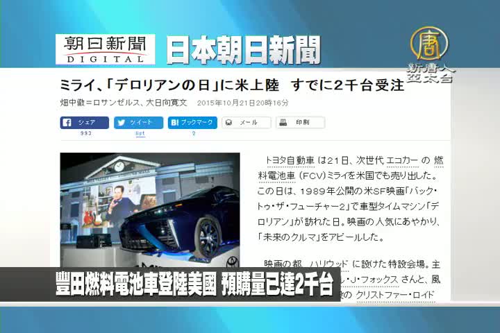 【新唐人亞太台 2015 年 10 月 22 日訊】來看到日本朝日新聞報導:豐田燃料電池車登陸美國 預購量已達2千台