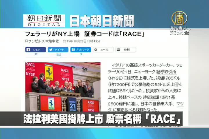 【新唐人亞太台 2015 年 10 月 23 日訊】來看到日本朝日新聞報導:法拉利美國掛牌上市 股票名稱「RACE」
