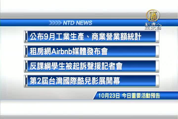 【新唐人亞太台 2015 年 10 月 23 日訊】接著看到,今天,十月23日,星期五,有哪些重要活動,經濟部公布104年9月份工業生產、商業營業額統計;租房網Airbnb媒體發布會;反課綱學生被起訴聲援記者會;以及,第2屆台灣國際酷兒影展開幕。