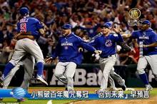 2016-11-04 12:55:27美國職棒大聯盟新世界冠軍出爐,由芝加哥小熊隊打破108年的魔咒順利奪冠,其實,1989年上映的「回到未來2」曾鐵口直斷,預言芝加哥小熊隊將會再2015年打破魔咒順利奪冠,但沒有成真,直到今年才終於順利奪冠;「回到未來」系列昔日的男主角米高福克斯也在推特上,幽默恭喜小熊隊,並自嘲「雖然晚了一年」