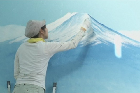 沾上白色顏料,一筆一筆勾勒出的是富士山上美麗的雪景。現年32歲的田中水木(MIZUKI TANAKA)是日本目前最年輕,也是唯一以繪製澡堂壁畫維生的女性。