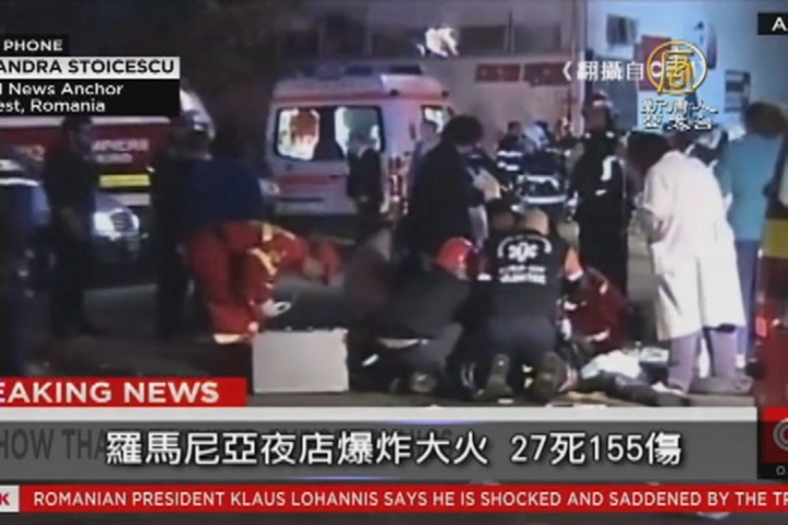 【新唐人亞太台 2015 年 10 月 31 日訊】羅馬尼亞首都布加勒斯特的一家夜店30日深夜因為表演煙火時,不慎觸及易燃物而引起爆炸失火,造成至少27人死亡、180人受傷。
