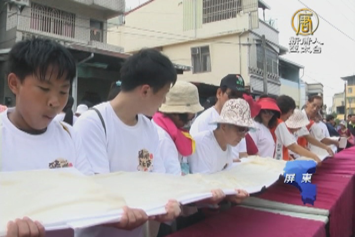 【新唐人亞太台 2015 年 11 月 01 日訊】屏東萬巒鄉週六(10/31)挑戰「最長粄條」金氏世界紀錄,集結約一千人參與,但只拉到210公尺就斷了,沒能超越世界紀錄548.7公尺,但豬腳節的人氣依然熱絡不受影響,主辦單位承諾,明年再來拼一次。