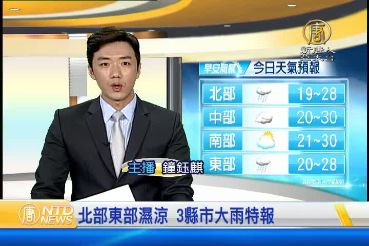 【新唐人亞太台 2015 年 11 月 03 日訊】歡迎您收看11月3日的早安新唐人,我是鐘鈺麒。先來帶您關心今天的天氣情況。氣象局表示,今天天氣和昨天類似,各地清晨以及有雨時感覺較涼,尤其大台北及宜蘭花蓮地區。一整天氣溫在19到24度之間,雖然白天高溫略為回升,但感覺依然偏濕涼。北部、東半部雲量偏多有短暫雨,氣象局在今天凌晨3點多,也對新北市、基隆市及宜蘭縣發布大雨特報,提醒這些地區的民眾要特別留意。帶您一起來看到國際媒體重要訊息。