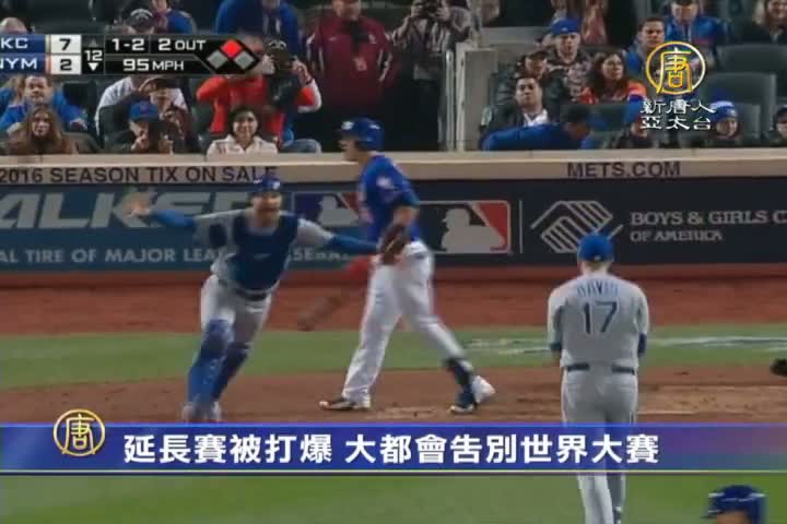 【新唐人亞太台 2015 年 11 月 03 日訊】美國職棒世界大賽第5戰,背水一戰,大都會再拿3個出局數就能以2:0獲勝拚出第6戰,皇家卻再次展現驚人韌性,先在第9局一舉扳平逼入本屆第2場延長賽,再於第12局鯨吞5分,皇家以4勝1敗擊敗大都會,相隔30年再奪世界大賽冠軍,也是隊史第2冠。