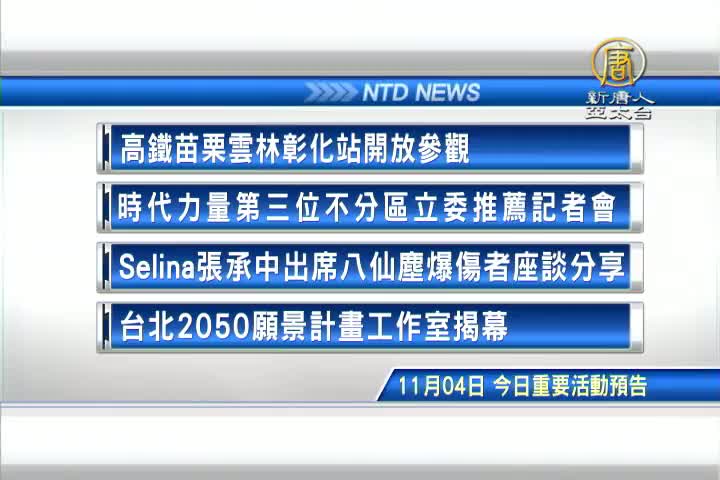 【新唐人亞太台 2015 年 11 月 04 日訊】接著看到,今天,11月4日,星期三,有哪些重要活動,高鐵苗栗雲林彰化站落成,開放民眾參觀,時代力量主席團第三位不分區立委、台大經濟系鄭秀玲教授推薦記者會;Selina張承中出席八仙塵爆傷者座談分享;以及,台北2050願景計畫工作室揭幕活動。