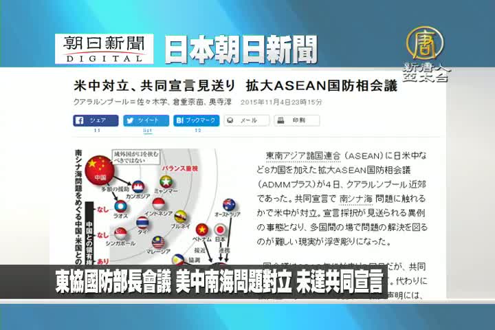 【新唐人亞太台 2015 年 11 月 05 日訊】來看到日本朝日新聞報導:東協國防部長會議 美中南海問題對立 未達共同宣言