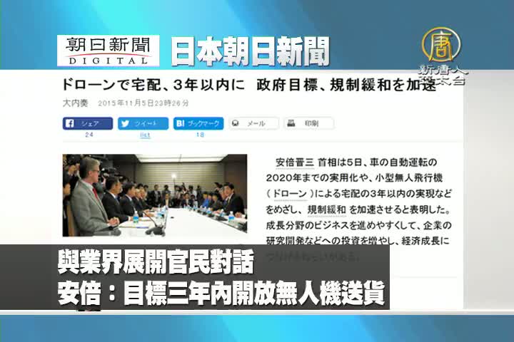 【新唐人亞太台 2015 年 11 月 06 日訊】來看到日本朝日新聞報導:與業界展開官民對話 安倍表示 目標三年內開放無人機送貨