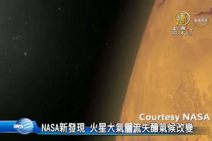 【新唐人亞太台 2015 年 11 月 06 日訊】美國太空總署在台北時間今天凌晨3點,發布對於火星大氣層的「關鍵發現」。從太空總署的火星探測器「馬文」傳回的數據顯示,火星的氣候曾發生改變。早期的火星較溫暖也較潮濕,可能曾有生命體,現在的火星則變得寒冷乾燥,很可能是因為太陽風暴襲擊,火星大氣層明顯流失,導致火星氣候改變。