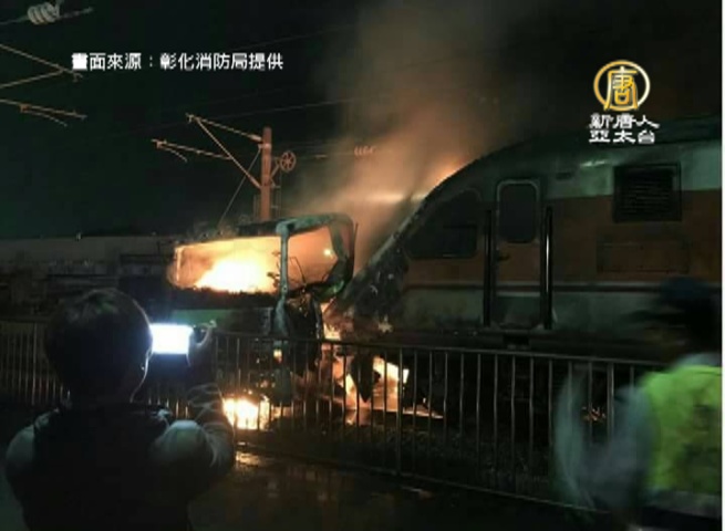 【新唐人亞太台 2015 年 11 月 07 日訊】台鐵一輛由屏東潮州開往七堵的自強號,今天晚間6點多,在彰化二水站南邊附近,撞上一輛闖越平交道的貨櫃車,造成貨櫃車當場起火燃燒,造成9人受傷。估計有1萬5千名乘客受影響。