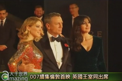 007系列最新一集的世界首映會,巨星們來到倫敦皇家阿爾伯特音樂廳(Royal Albert Hall)前的紅地毯,立刻吸引大批鎂光燈。主角丹尼爾·克雷格(Daniel Craig)一身黑色箭領西裝,搭配酷似花瓣的紅綠色造型領針。女星娜奧米·哈里斯(NAOMIE HARRIS)一身橘色修身無肩素色晚禮服,搭配短項鍊。女星蕾雅·瑟杜(LEA SEYDOUX),一身金色亮片連身服裝,耀眼奪目。女星莫妮卡·貝魯奇(MONICA BELLUCCI)則是一身墨綠色絨布晚禮服,顯得低調許多。