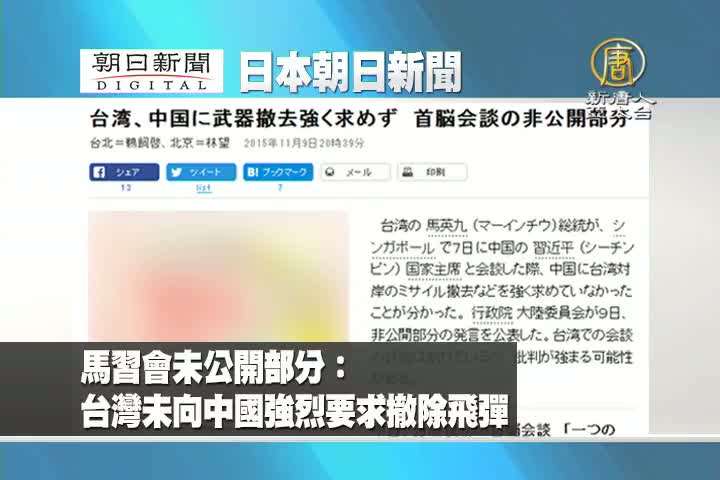 【新唐人亞太台 2015 年 11 月 10 日訊】來看到日本朝日新聞報導:馬習會閉門會談:台灣未向中國強烈要求撤除飛彈