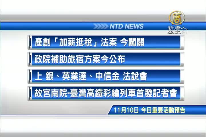 【新唐人亞太台 2015 年 11 月 10 日訊】接著看到,今天,11月10日,星期二,有哪些重要活動。首先是,證所稅中的產創「加薪抵稅」法案,今天要在立院闖關。以及,行政院補助旅宿方案,今天會公布。繼續是財經消息,上 銀、英業達、中信金都在今天舉辦法說會。另外,今天有一場,故宮南院-高鐵彩繪列車首發記者會。