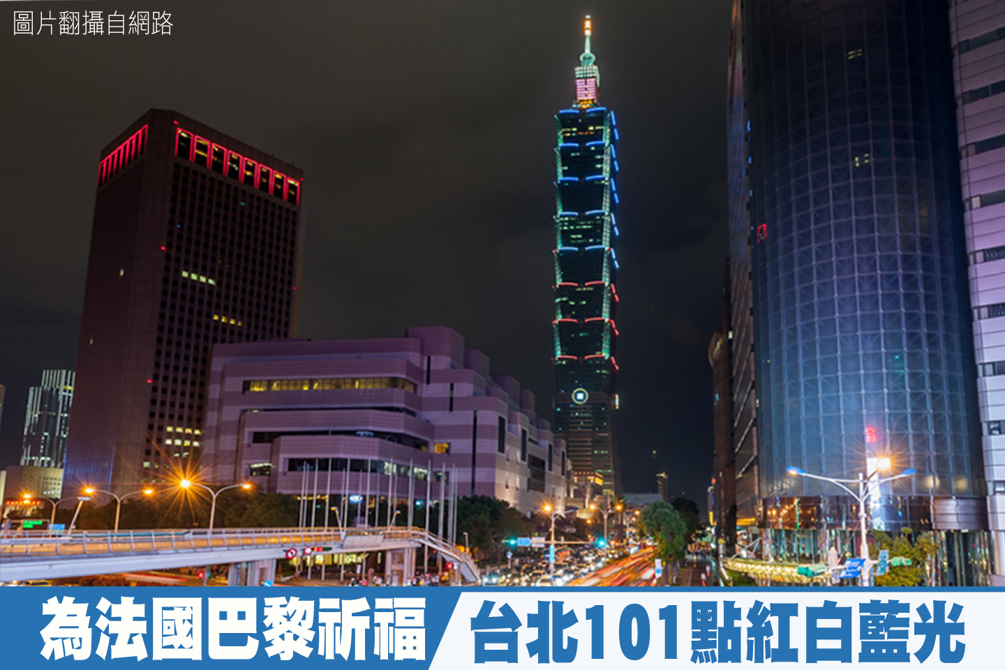 週末傍晚五點30分,台北101大樓,點亮法國國旗的紅白藍燈光,為法國昨晚發生的恐怖攻擊事件,表達哀悼之意。包含美國新世貿中心、英國溫布利球場、紐約帝國大 廈、美國達拉斯、杜拜帆船酒店等世界指標性建築,都亮起紅白藍燈,全球一起為法國祈福。