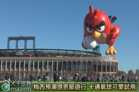 梅西百貨感恩節大遊行已經有88年的歷史, 每年的遊行氣球都會有不同的角色, 今年第89屆遊行是由冰河時代的松鼠、Angry Birds(憤怒鳥)、麥當勞叔叔,還有可愛的綠色雷龍,在當天帶大人小孩一起慶祝感恩節以及聖誕節的到來。