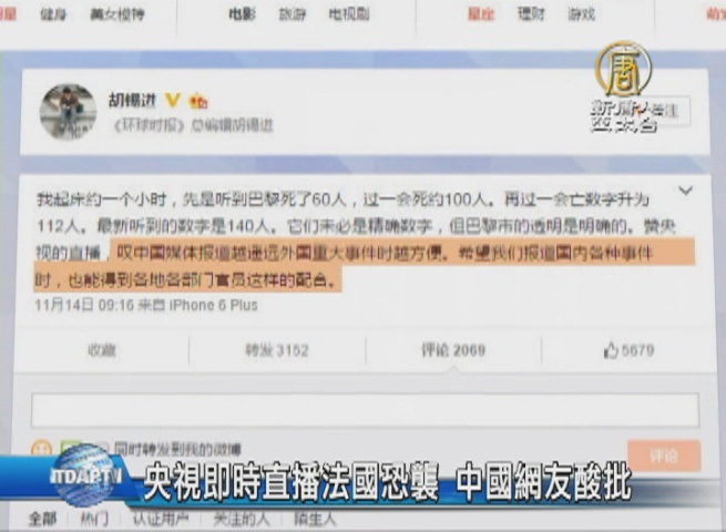 【新唐人亞太台 2015 年 11 月 16 日訊】震驚全球的法國恐怖襲擊事件發生後,中共《央視》第一時間進行了實況轉播,中國媒體也24小時滾動更新,各種評論鋪天蓋地。對此《環球時報》總編輯胡錫進在微博「熱讚」,而網民則嘲諷:《央視》報導別國災難,可謂一向「即時透明」。