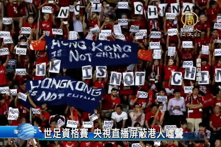 【新唐人亞太台 2015 年 11 月 18 日訊】昨天晚間在香港旺角舉行的世界盃足賽亞洲區資格賽,由香港對上中國,上演「港中大戰」,最後以0:0完場。有香港球迷高舉著,「HK IS NOT CHINA」的牌子,還有眾多球迷舉「BOO」的牌子,用文字噓中共國歌。中共央視在直播比賽時,怕中國民眾聽到香港球迷噓中共國歌的聲音。又再次在直播中將現場聲音屏蔽。