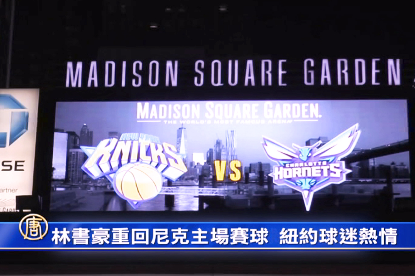 記者 柯婷婷:「本賽季加盟夏洛特黃蜂隊的華裔NBA明星林書豪,再一次回到他發跡的球場—紐約麥迪遜廣場花園,在今晚的賽事中,林書豪在黃蜂隊出場,客場挑戰他的老東家---紐約尼克斯隊。比賽之前,場外的球迷已經情緒高漲,很多華裔球迷都是來為林書豪加油。」