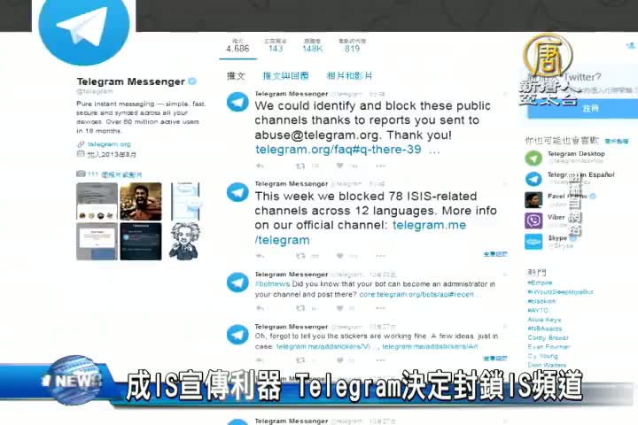 【新唐人亞太台 2015 年 11 月 19 日訊】總部位在德國柏林的即時通訊軟體Telegram,因為訊息傳送絕對隱密,成為激進組織伊斯蘭國傳送訊息及召募戰士的即時通信工具。在巴黎恐攻之後,Telegram決定採取行動,周三宣布,已在12種語言版本的服務中,封鎖78個與IS相關的頻道。