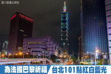2015-11-14 21:30:48全世界與法國巴黎同在!世界各地知名地標,紛紛以藍白紅3色燈光,為法國加油,台北的101,也在傍晚五點三十分,點亮象徵自由平等博愛的藍白紅三色燈,一起為法國祈福。