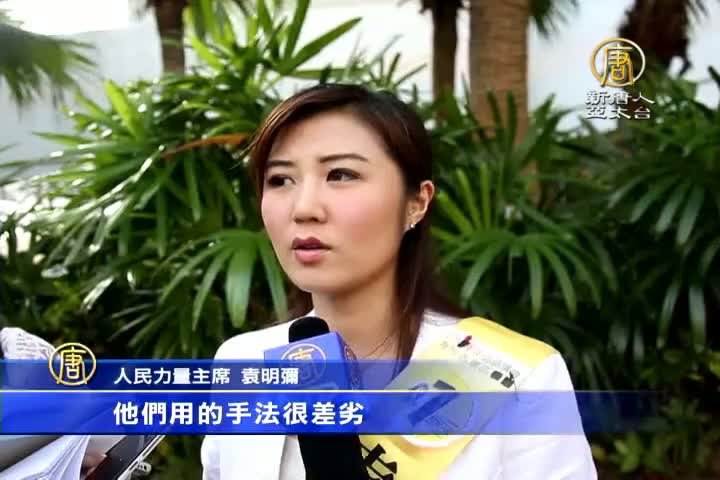 人民力量主席 袁明彌:「但他們用的手法很差劣。例如有些大媽在我的facebook用粗口鬧我,經常鬧我,我也拍了一段。他們經常在屋苑內違規拉票,也有做家訪,其實這裏是不允許做家訪,他們一直用這種手段。」